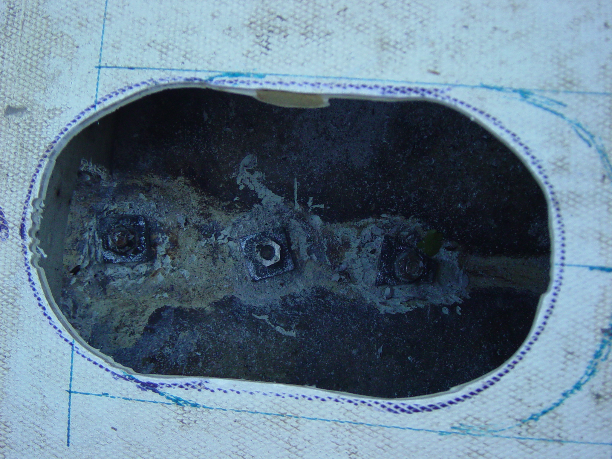 Päta sťažńovej vzpery v kajutovom dne sa pod tlakom prehýbala dovnútra. Po otvorení dna som objavil zhnitú drevenú štruktúru, ktorú nahradím novou.