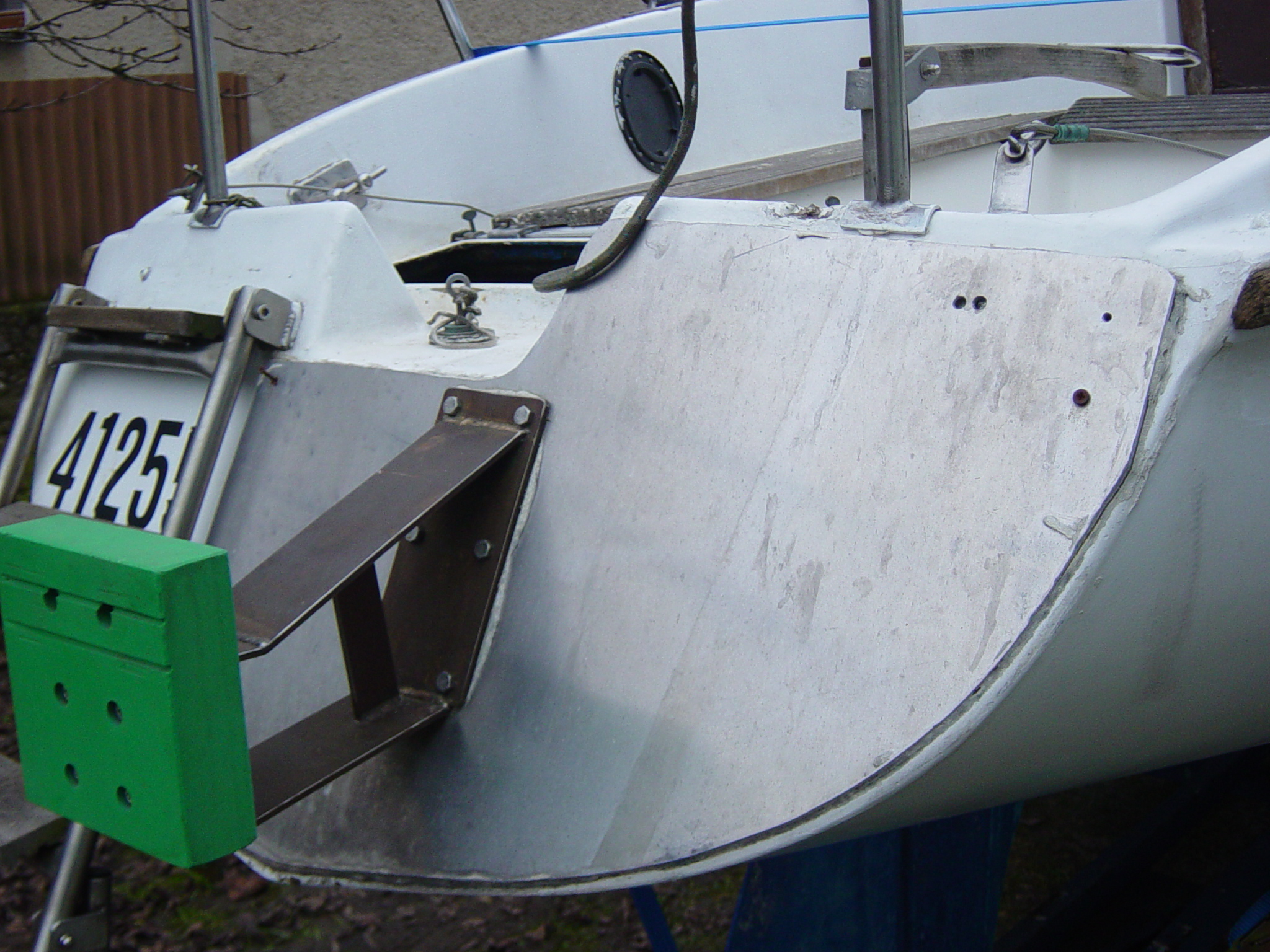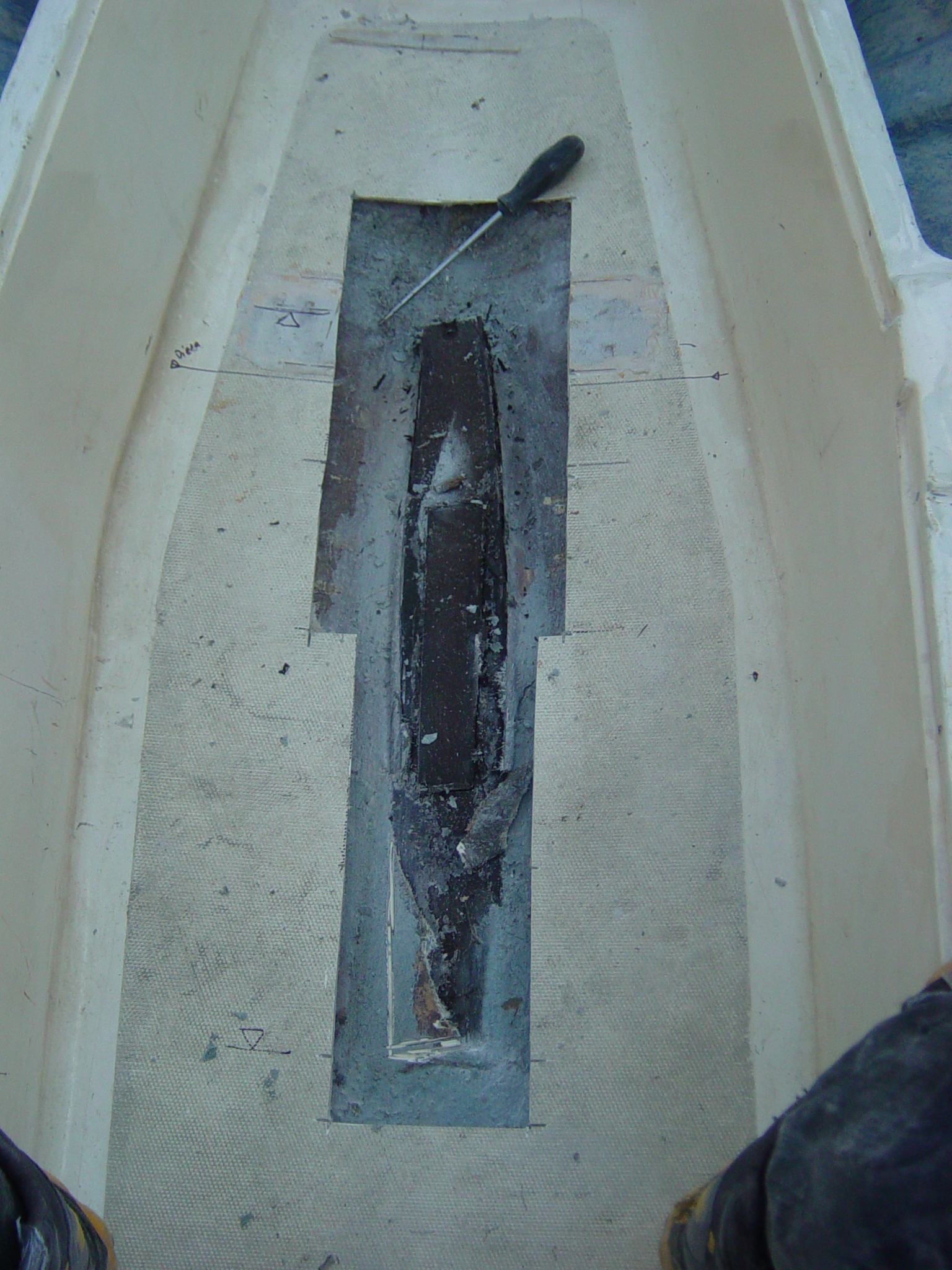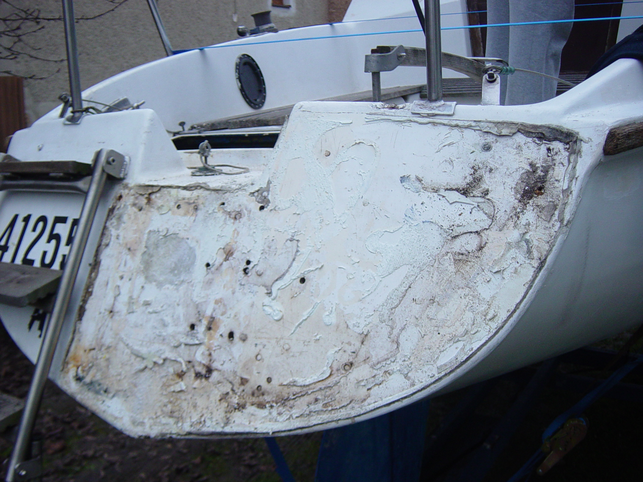 Podponor. V nadponorovej časti sa po odbrúsení niekoľkých starých náterov ukázal krásne zachovalý gelcout. Na podponore som gelcout nenašiel. Podponorová časť bola od nadponorovej oddelená dvoma drážkami (z formy pri laminovaní). Na podponore bola priamo na lamináte iba vrstva polyesterového tmelu. Aj keď to nie je obvyklé, myslím že tak bola loď vyrobená.