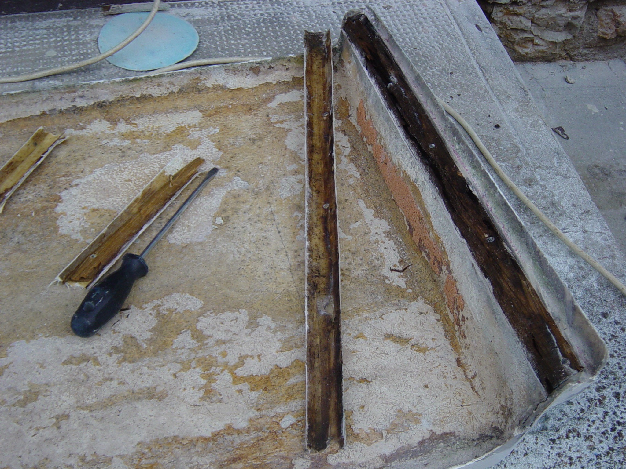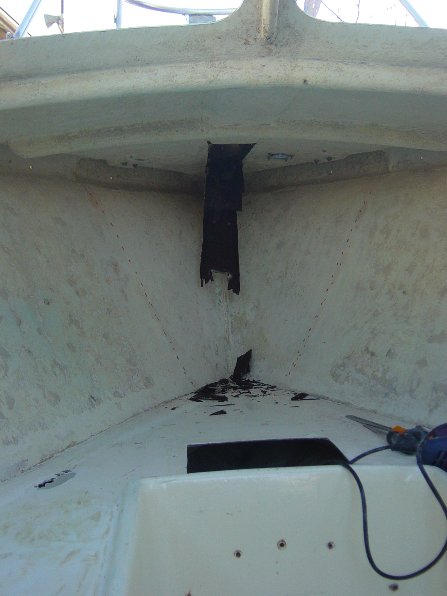 V okolí upevnenia kovania predného vantu a dreveného väzníka vidieť hlboké praskliny (skrz celú hrúbku laminátu). Budú opravené zvnútra. Prístup k nim je po odstránení prednej priečky, ktorá tiež mala prehnité jadro z mahagónovej preglejky.